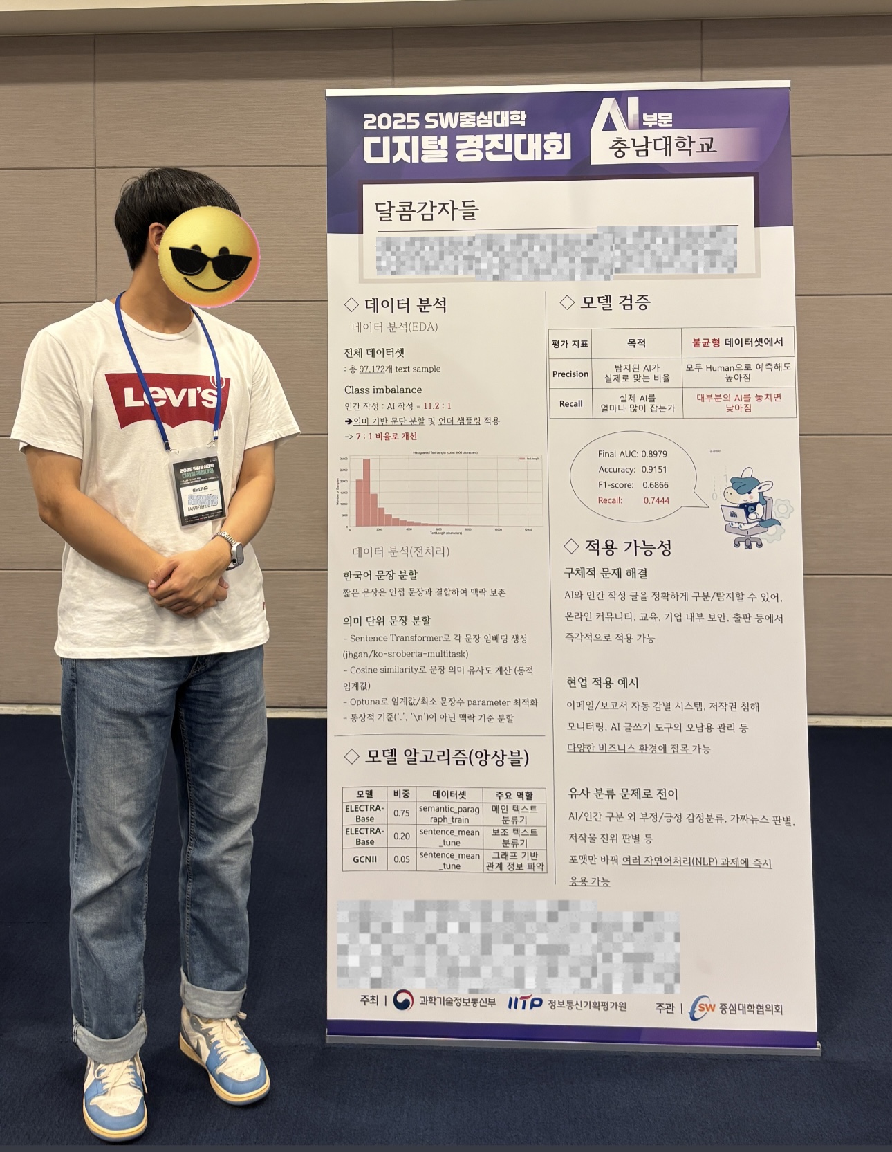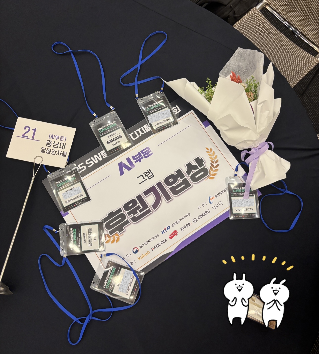 포스터 세션이 준비되어있어서 다른 팀들은 어떤 아이디어를 썼는지 공유해볼 수 있어서 참 좋았습니다. 다시금 느끼지만 이런 대회는 수상도 중요하지만 커넥션도 중요한거 같아요~ 깨알같이 들어간 우리학교의 마스코트 차차!!